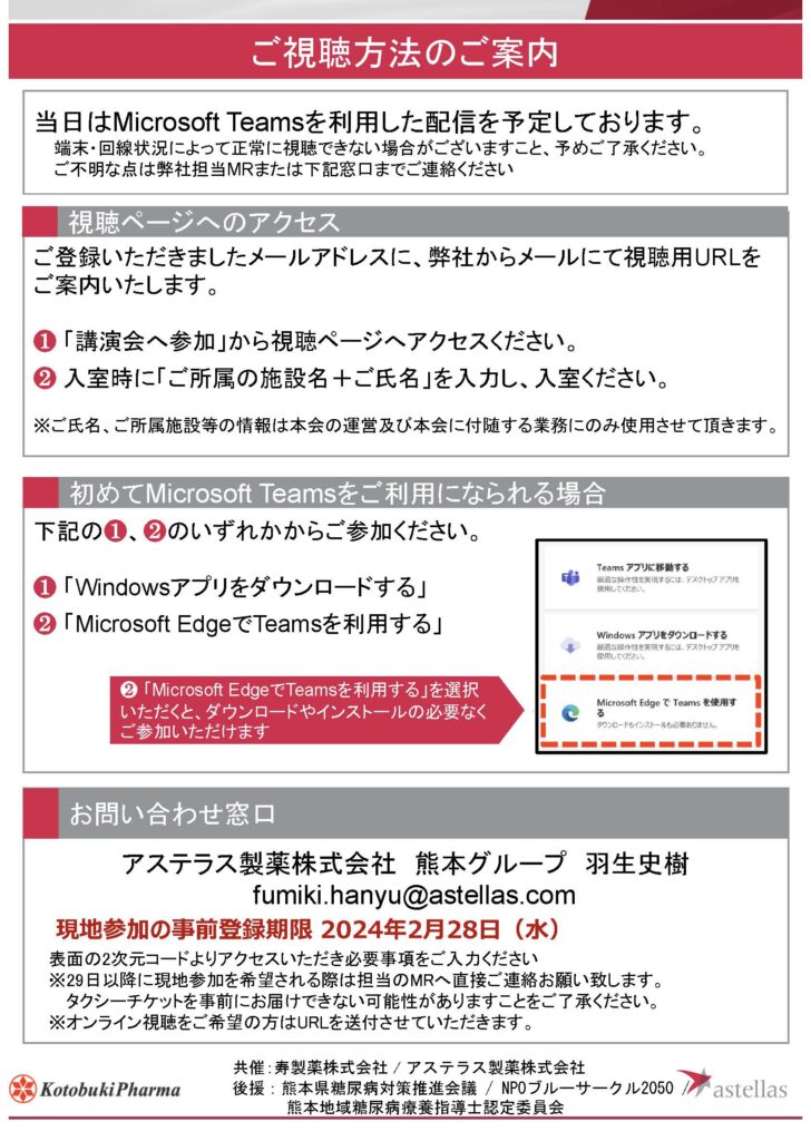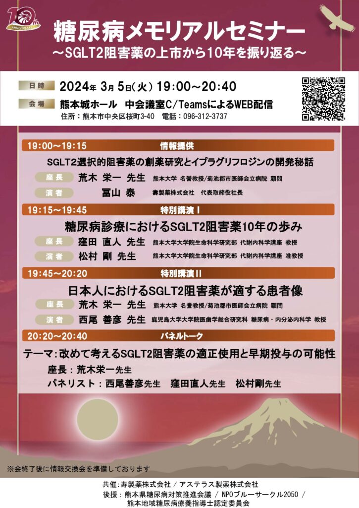 糖尿病メモリアルセミナーのご案内 2024.02.16 【お知らせ】糖尿病メモリアルセミナーのご案内です 2024年3月5日(火)19:00~20:40 熊本城ホール 中会議室C/TeamsによるWEB配信 当科の阪口雅司先生が 第44回日本肥満学会/第41回日本肥満症治療学会学術集会にてJASSO学術奨励賞を受賞されました。 前の記事 ホームページリニューアルのお知らせ 次の記事